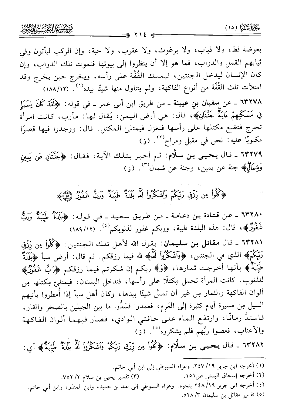 ٦٣٢٨١ - قال مقاتل بن سليمان: يقول الله لأهل تلك الجنتين: {كُلُوا مِن رِزْقِ رَبِّكُمْ} الذي في الجنتين، {واشْكُرُوا لَهُ} لله فيما رزقكم. ثم قال: أرض سبأ {بَلْدَةٌ طَيِّبَةٌ} بأنها أخرجت ثمارها، {و} ربكم إن شكرتم فيما رزقكم {رَبٌّ غَفُور} للذنوب. كانت المرأة تحمل مِكتلًا على رأسها، فتدخل البستان، فيمتلئ مِكتلها مِن ألوان الفاكهة والثمار مِن غير أن تمسَّ شيئًا بيدها، وكان أهل سبأ إذا أُمطروا يأتيهم السيل مِن مسيرة أيام كثيرة إلى العَرِم، فعمدوا فسَدُّوا ما بين الجبلين بالصخر والقار، فاستدَّ زمانًا، وارتفع الماء على حافتي الوادي، فصار فيهما ألوان الفاكهة والأعناب، فعصوا ربَّهم فلم يشكروه (¬٥). (ز)