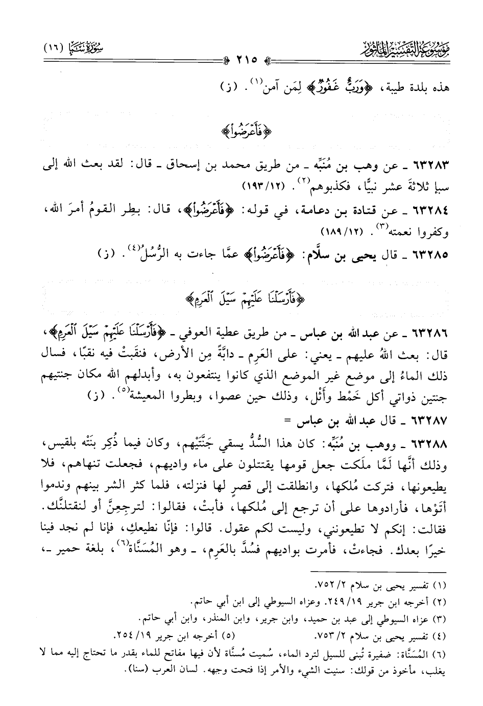 ٦٣٢٨٨ - ووهب بن مُنَبِّه: كان هذا السُّدُّ يسقي جَنَّتَيْهم، وكان فيما ذُكِر بنَتْه بلقيس، وذلك أنّها لَمّا ملَكت جعل قومها يقتتلون على ماء واديهم، فجعلت تنهاهم، فلا يطيعونها، فتركت مُلكها، وانطلقت إلى قصرٍ لها فنزلته، فلما كثر الشر بينهم وندموا أتَوْها، فأرادوها على أن ترجع إلى مُلكها، فأبتْ، فقالوا: لترجِعِنَّ أو لنقتلنَّك. فقالت: إنكم لا تطيعونني، وليست لكم عقول. قالوا: فإنّا نطيعكِ، فإنا لم نجد فينا خيرًا بعدك. فجاءتْ، فأمرت بواديهم فسُدَّ بالعَرِم، -وهو المُسَنّاة (¬٦)، بلغة حمير-،