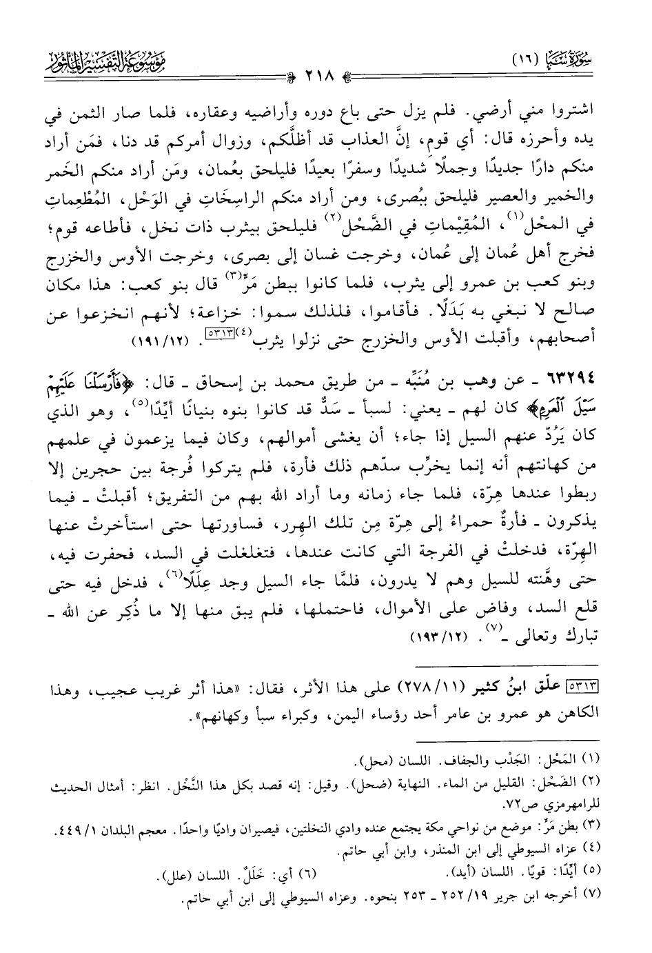 ٦٣٢٩٤ - عن وهب بن مُنَبِّه -من طريق محمد بن إسحاق- قال: {فَأَرْسَلْنا عَلَيْهِمْ سَيْلَ العَرِمِ} كان لهم -يعني: لسبأ- سَدٌّ قد كانوا بنوه بنيانًا أيِّدًا (¬٥)، وهو الذي كان يَرُدّ عنهم السيل إذا جاء؛ أن يغشى أموالهم، وكان فيما يزعمون في علمهم من كهانتهم أنه إنما يخرِّب سدّهم ذلك فأرة، فلم يتركوا فُرجة بين حجرين إلا ربطوا عندها هِرّة، فلما جاء زمانه وما أراد الله بهم من التفريق؛ أقبلتْ -فيما يذكرون- فأرةٌ حمراءُ إلى هِرّة مِن تلك الهِرر، فساورتها حتى استأخرتْ عنها الهِرّة، فدخلتْ في الفرجة التي كانت عندها، فتغلغلت في السد، فحفرت فيه، حتى وهَّنته للسيل وهم لا يدرون، فلمّا جاء السيل وجد عِلَلًا (¬٦)، فدخل فيه حتى قلع السد، وفاض على الأموال، فاحتملها، فلم يبق منها إلا ما ذُكِر عن الله -تبارك وتعالى- (¬٧). (١٢/ ١٩٣)
