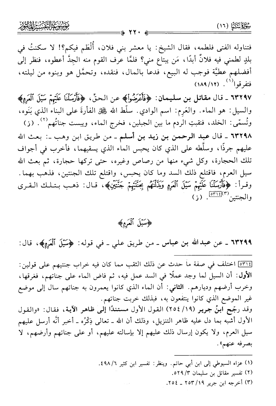 ٦٣٢٩٨ - قال عبد الرحمن بن زيد بن أسلم -من طريق ابن وهب-: بعث الله عليهم جرذًا، وسلَّطه على الذي كان يحبس الماء الذي يسقيهما، فأخرب في أجواف تلك الحجارة، وكل شيء منها من رصاص وغيره، حتى تركها حجارة، ثم بعث الله سيل العرم، فاقتلع ذلك السد وما كان يحبس، واقتلع تلك الجنتين، فذهب بهما. وقرأ: {فَأَرْسَلْنا عَلَيْهِمْ سَيْلَ العَرِمِ وبَدَّلْناهُمْ بِجَنَّتَيْهِمْ جَنَّتَيْنِ}، قال: ذهب بتلك القرى والجنتين (¬٣) [٥٣١٤]. (ز)