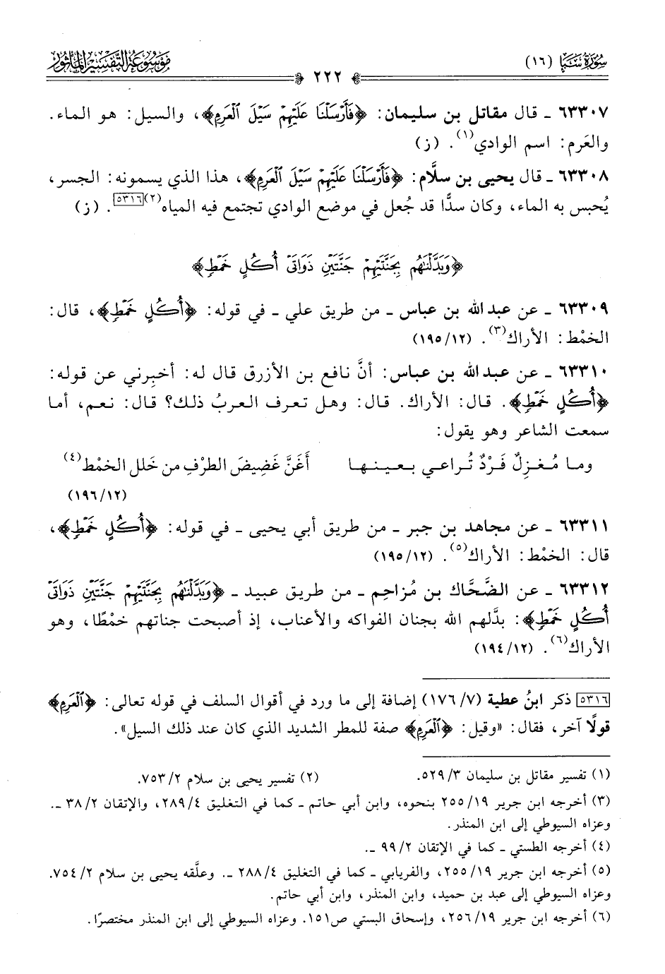 ٦٣٣٠٨ - قال يحيى بن سلّام: {فَأَرْسَلْنا عَلَيْهِمْ سَيْلَ العَرِمِ}، هذا الذي يسمونه: الجسر، يُحبس به الماء، وكان سدًّا قد جُعل في موضع الوادي تجتمع فيه المياه (¬٢) [٥٣١٦]. (ز)