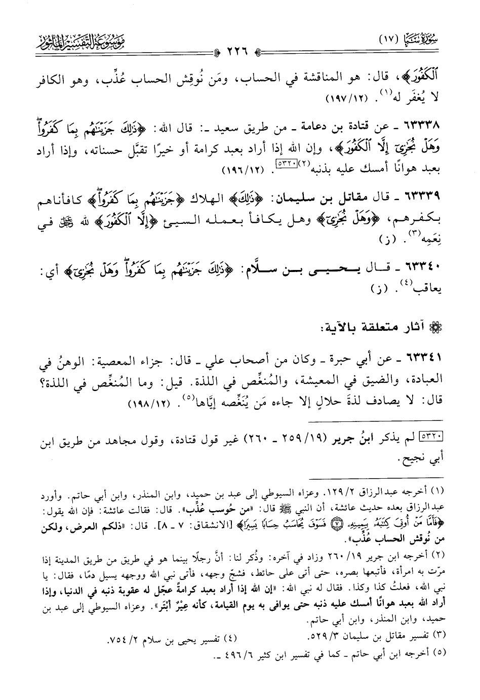 ٦٣٣٣٨ - عن قتادة بن دعامة -من طريق سعيد-: قال الله: {ذَلِكَ جَزَيْناهُمْ بِما كَفَرُوا وهَلْ نُجازِي إلّا الكَفُورَ}، وإن الله إذا أراد بعبد كرامة أو خيرًا تقبَّل حسناته، وإذا أراد بعبد هوانًا أمسك عليه بذنبه (¬٢) [٥٣٢٠]. (١٢/ ١٩٦)