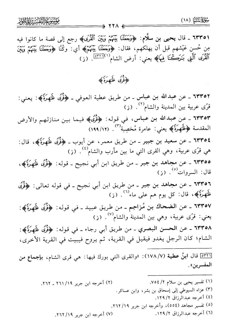 [٥٣٢١] قال ابنُ عطية (٧/ ١٧٨): «والقرى التي بورك فيها: هي قرى الشام، بإجماع من المفسرين».