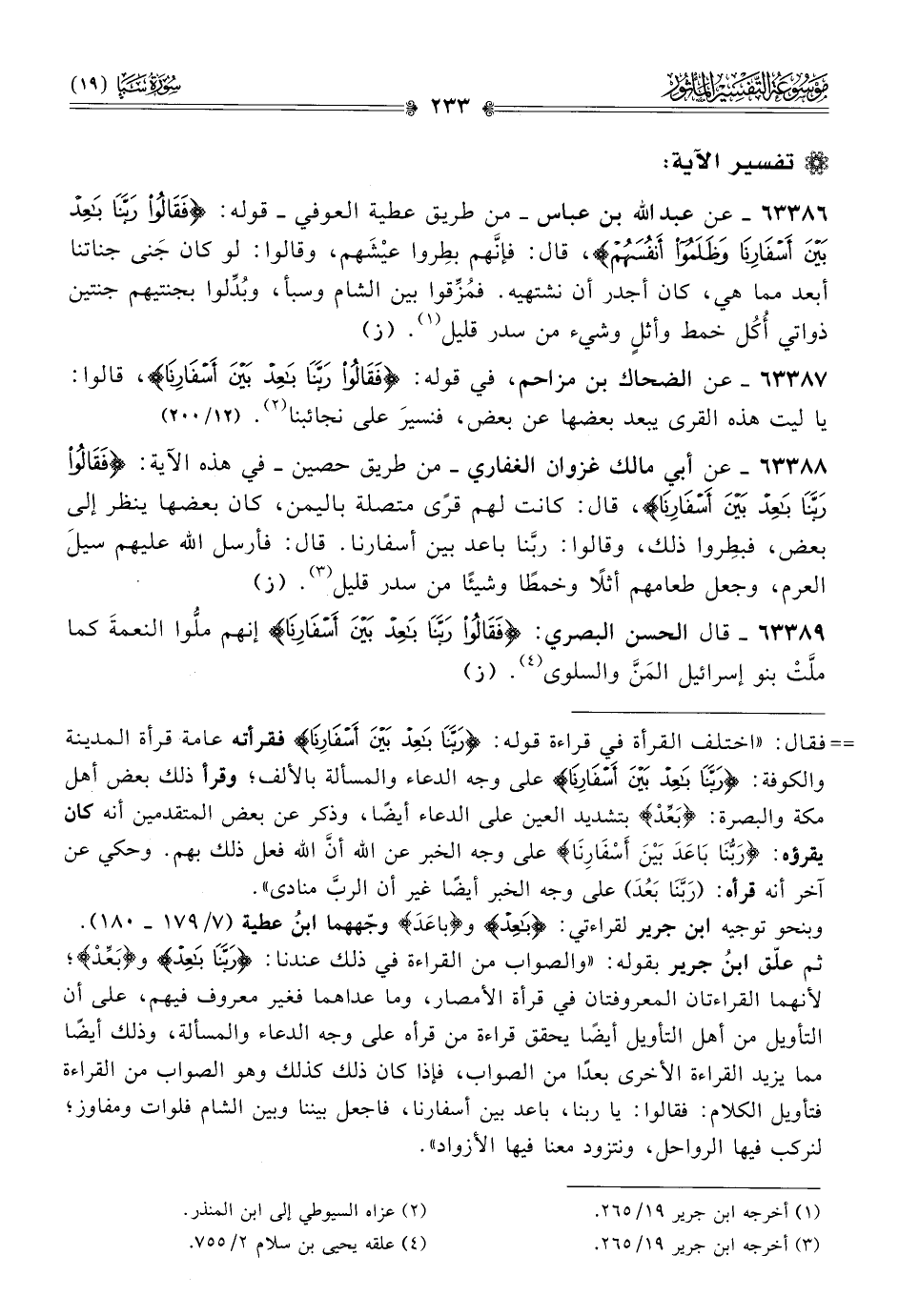٦٣٣٨٧ - عن الضحاك بن مزاحم، في قوله: {فَقالُوا رَبَّنا باعِدْ بَيْنَ أسْفارِنا}، قالوا: يا ليت هذه القرى يبعد بعضها عن بعض، فنسيرَ على نجائبنا (¬٢). (١٢/ ٢٠٠)