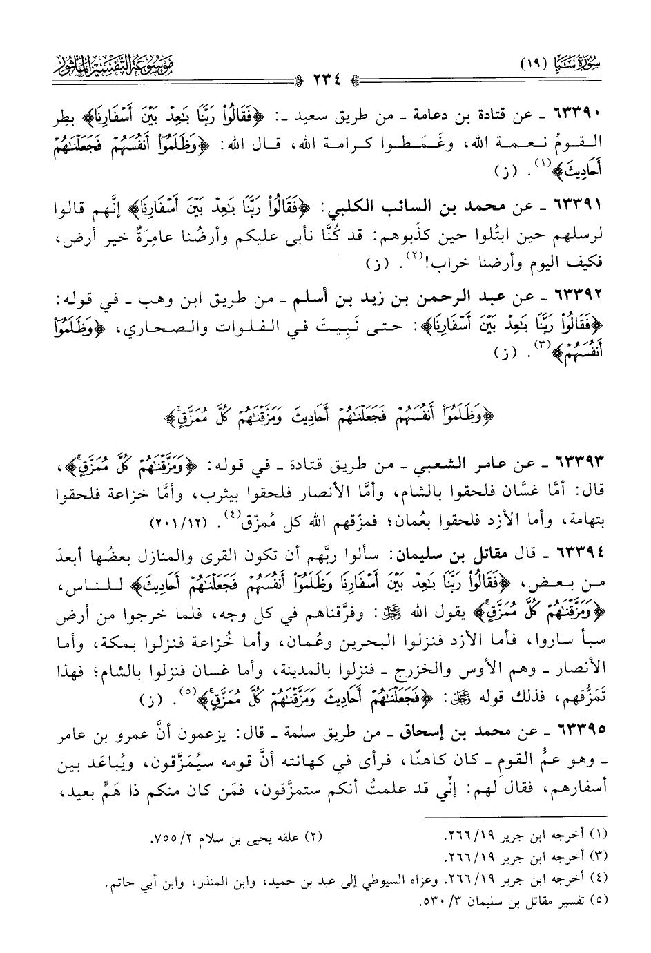 ٦٣٣٩٠ - عن قتادة بن دعامة -من طريق سعيد-: {فَقالُوا رَبَّنا باعِدْ بَيْنَ أسْفارِنا} بطِر القومُ نعمة الله، وغَمَطوا كرامة الله، قال الله: {وظَلَمُوا أنْفُسَهُمْ فَجَعَلْناهُمْ أحادِيثَ} (¬١). (ز)