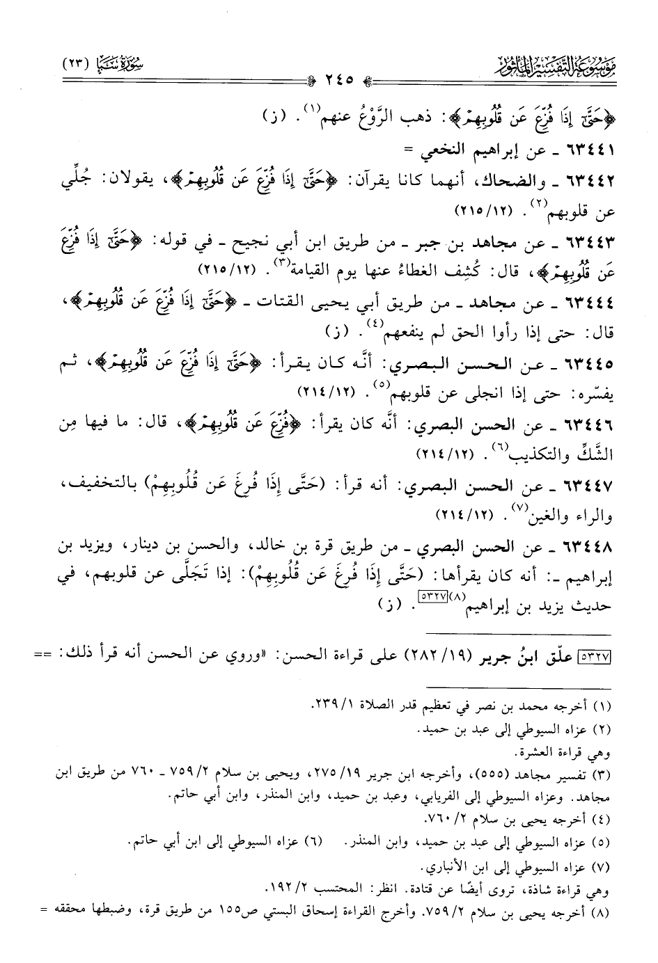 ٦٣٤٤٥ - عن الحسن البصري أنّه كان يقرأ: {حَتّى إذا فُزِّعَ عَنْ قُلُوبِهِمْ}، ثم يفسّره: حتى إذا انجلى عن قلوبهم (¬٥).