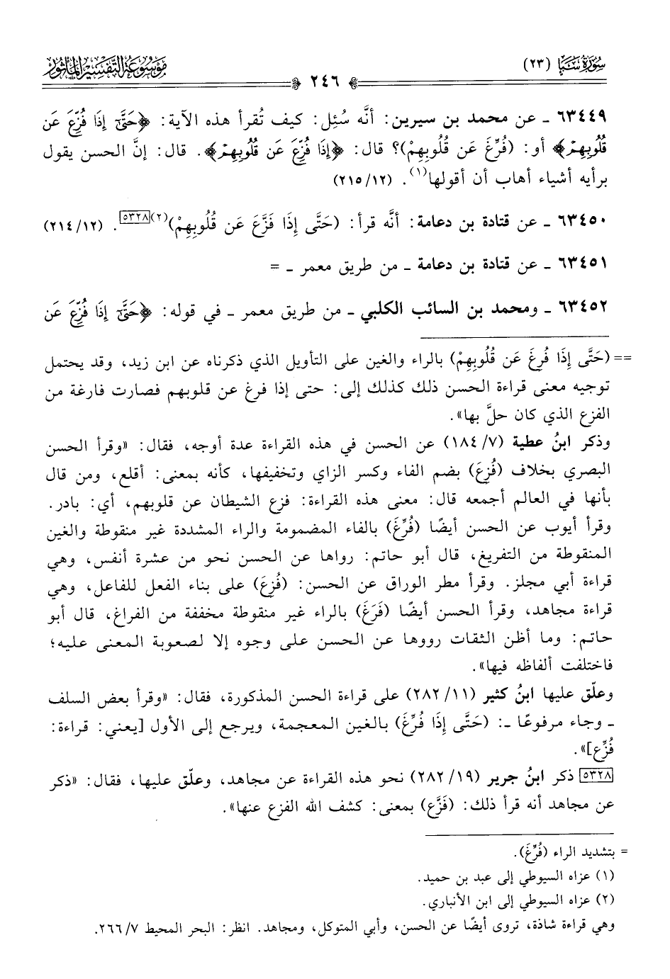 ٦٣٤٥٠ - عن قتادة بن دعامة، أنّه قرأ: (حَتّى إذا فَزَّعَ عَن قُلُوبِهِمْ) (¬٢) [٥٣٢٨]. (١٢/ ٢١٤)
