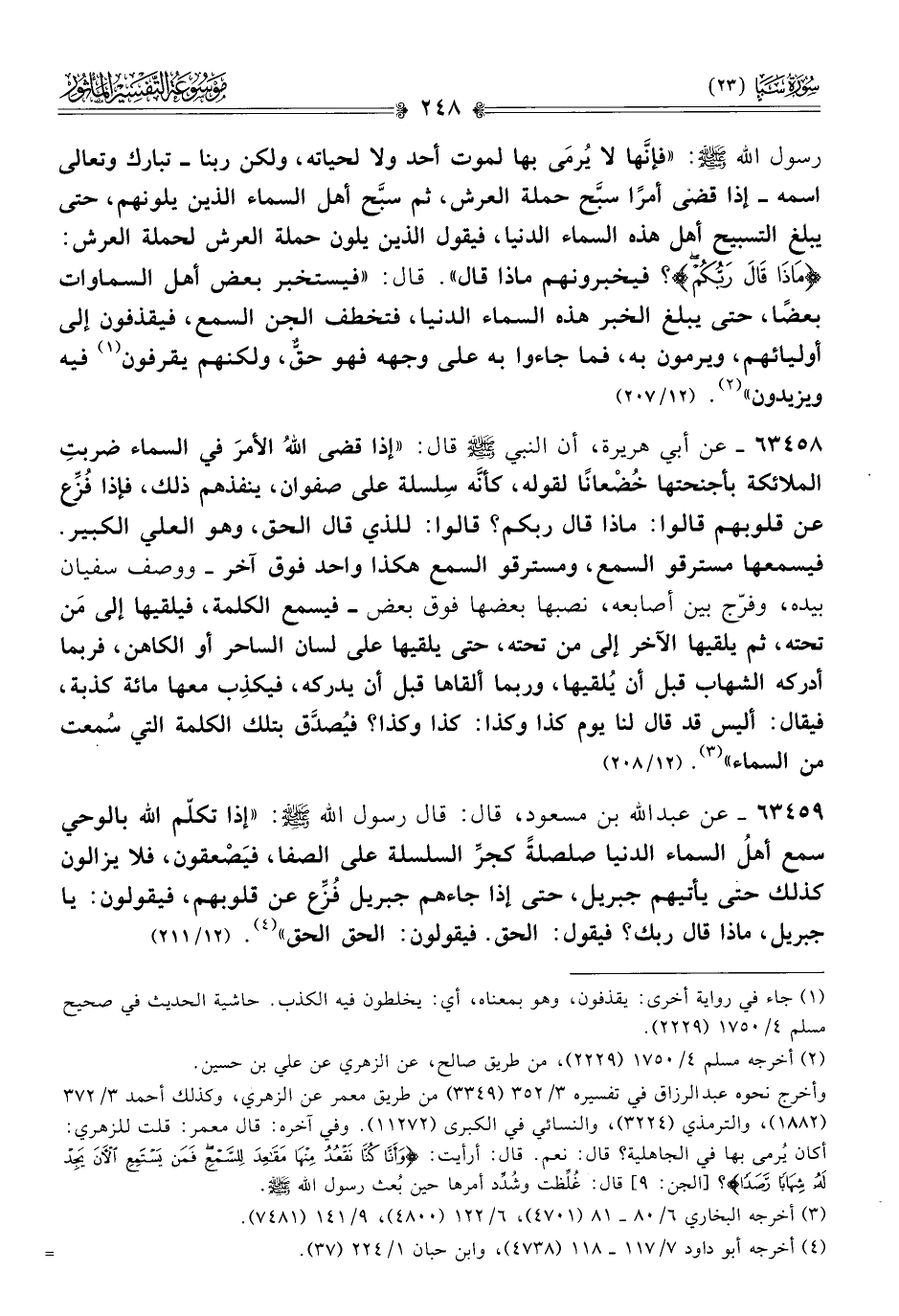 ٦٣٤٥٩ - عن عبد الله بن مسعود، قال: قال رسول الله - صلى الله عليه وسلم -: «إذا تكلّم الله بالوحي سمع أهلُ السماء الدنيا صلصلةً كجرِّ السلسلة على الصفا، فيَصْعقون، فلا يزالون كذلك حتى يأتيهم جبريل، حتى إذا جاءهم جبريل فُزِّع عن قلوبهم، فيقولون: يا جبريل، ماذا قال ربك؟ فيقول: الحق. فيقولون: الحق الحق» (¬٤). (١٢/ ٢١١)
