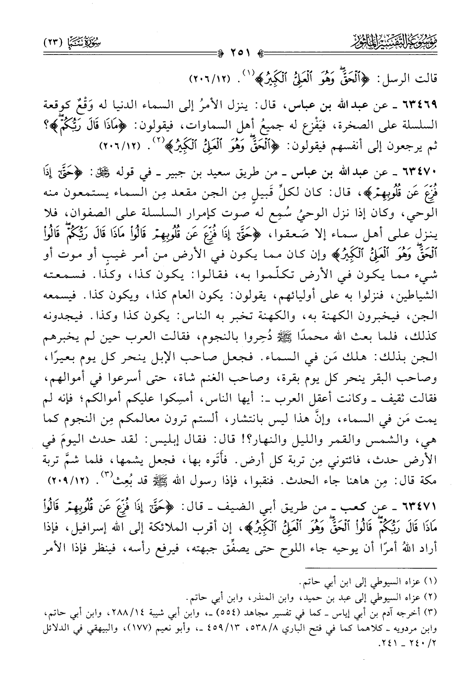 ٦٣٤٦٩ - عن عبد الله بن عباس، قال: ينزل الأمرُ إلى السماء الدنيا له وقْعٌ كوقعة السلسلة على الصخرة، فيَفْزع له جميعُ أهل السماوات، فيقولون: {ماذا قالَ رَبُّكُمْ}؟ ثم يرجعون إلى أنفسهم فيقولون: {الحَقَّ وهُوَ العَلِيُّ الكَبِيرُ} (¬٢). (١٢/ ٢٠٦)
