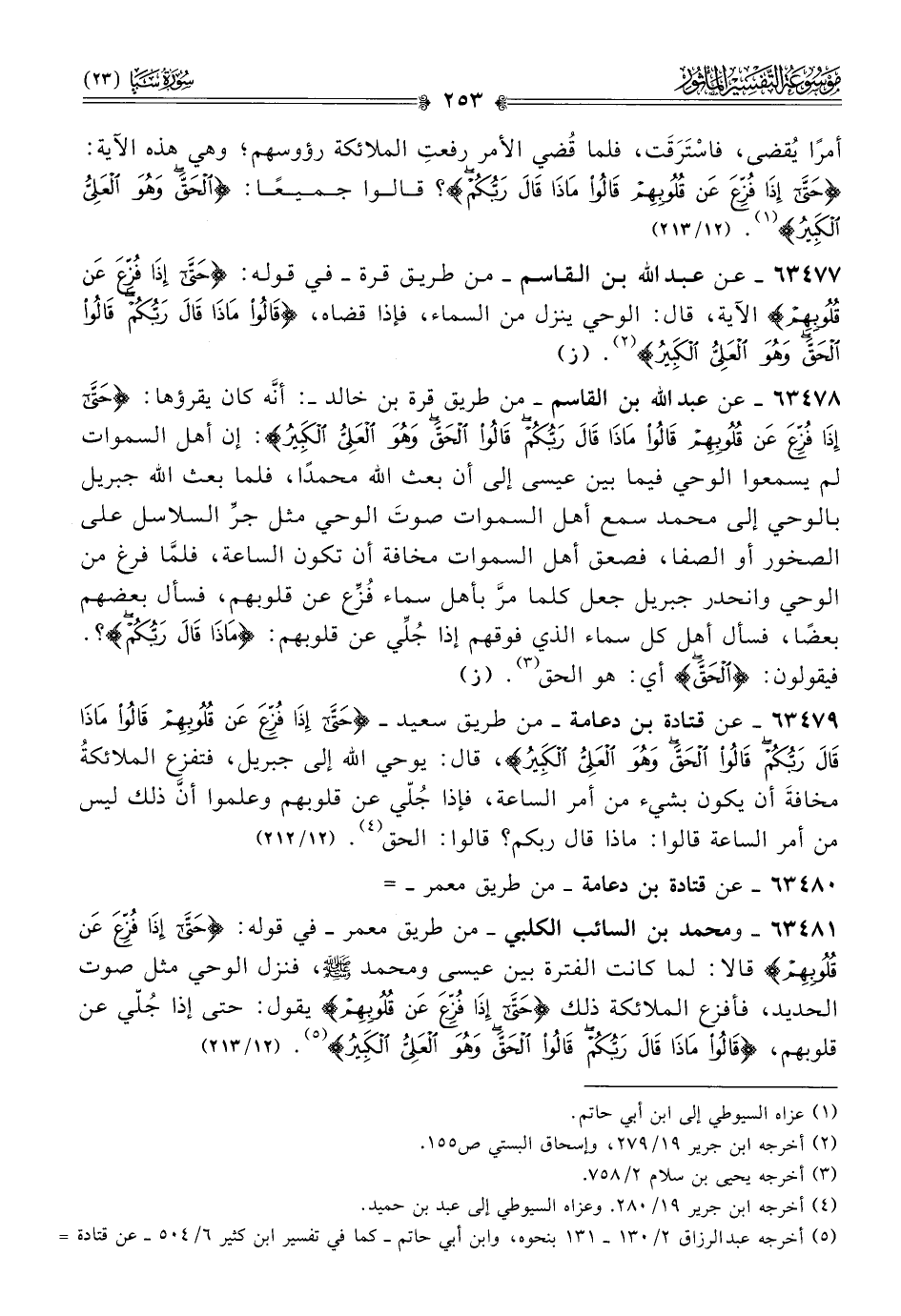 ٦٣٤٧٩ - عن قتادة بن دعامة -من طريق سعيد- {حَتّى إذا فُزِّعَ عَن قُلُوبِهِمْ قالُوا ماذا قالَ رَبُّكُمْ قالُوا الحَقَّ وهُوَ العَلِيُّ الكَبِيرُ}، قال: يوحي الله إلى جبريل، فتفزع الملائكةُ مخافةَ أن يكون بشيء من أمر الساعة، فإذا جُلّي عن قلوبهم وعلموا أنّ ذلك ليس من أمر الساعة قالوا: ماذا قال ربكم؟ قالوا: الحق (¬٤). (١٢/ ٢١٢)