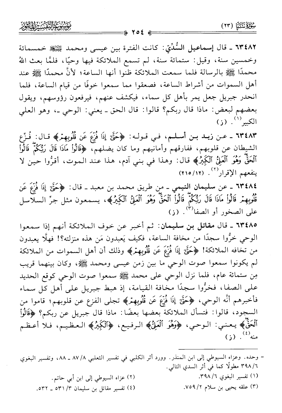 ٦٣٤٨٤ - عن سليمان التيمي -من طريق محمد بن معبد- قال: {حَتّى إذا فُزِّعَ عَن قُلُوبِهِمْ قالُوا ماذا قالَ رَبُّكُمْ قالُوا الحَقَّ وهُوَ العَلِيُّ الكَبِيرُ}، يسمعون مثل جرِّ السلاسل على الصخور أو الصفا (¬٣). (ز)