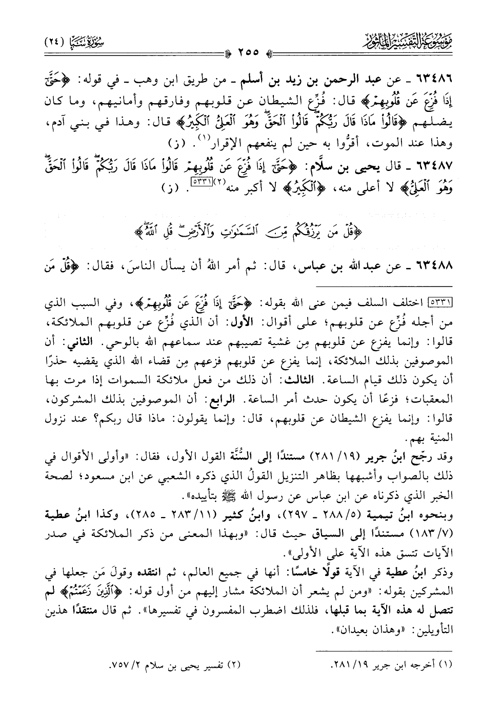 ٦٣٤٨٦ - عن عبد الرحمن بن زيد بن أسلم -من طريق ابن وهب- في قوله: {حَتّى إذا فُزِّعَ عَنْ قُلُوبِهِمْ} قال: فُزِّع الشيطان عن قلوبهم وفارقهم وأمانيهم، وما كان يضلهم {قالُوا ماذا قالَ رَبُّكُمْ قالُوا الحَقَّ وهُوَ العَلِيُّ الكَبِيرُ} قال: وهذا في بني آدم، وهذا عند الموت، أقرُّوا به حين لم ينفعهم الإقرار (¬١). (ز)