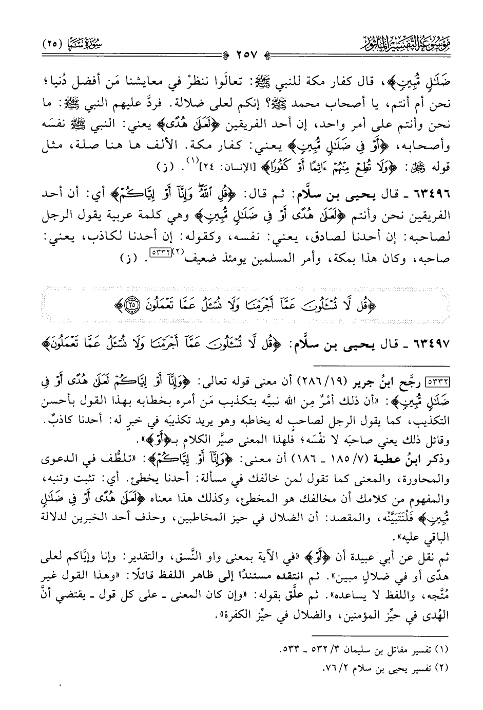 ٦٣٤٩٧ - قال يحيى بن سلّام: {قُلْ لا تُسْأَلُونَ عَمّا أجْرَمْنا ولا نُسْأَلُ عَمّا تَعْمَلُونَ}
