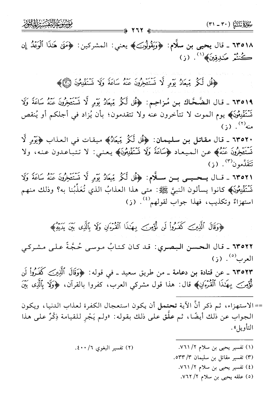 ٦٣٥٢١ - قال يحيى بن سلّام: {قُلْ لَكُمْ مِيعادُ يَوْمٍ لا تَسْتَأْخِرُونَ عَنْهُ ساعَةً ولا تَسْتَقْدِمُونَ} كانوا يسألون النبيَّ - صلى الله عليه وسلم -: متى هذا العذابُ الذي تُعَذِّبُنا به؟ وذلك منهم استهزاءٌ وتكذيب، فهذا جواب لقولهم (¬٤). (ز)
