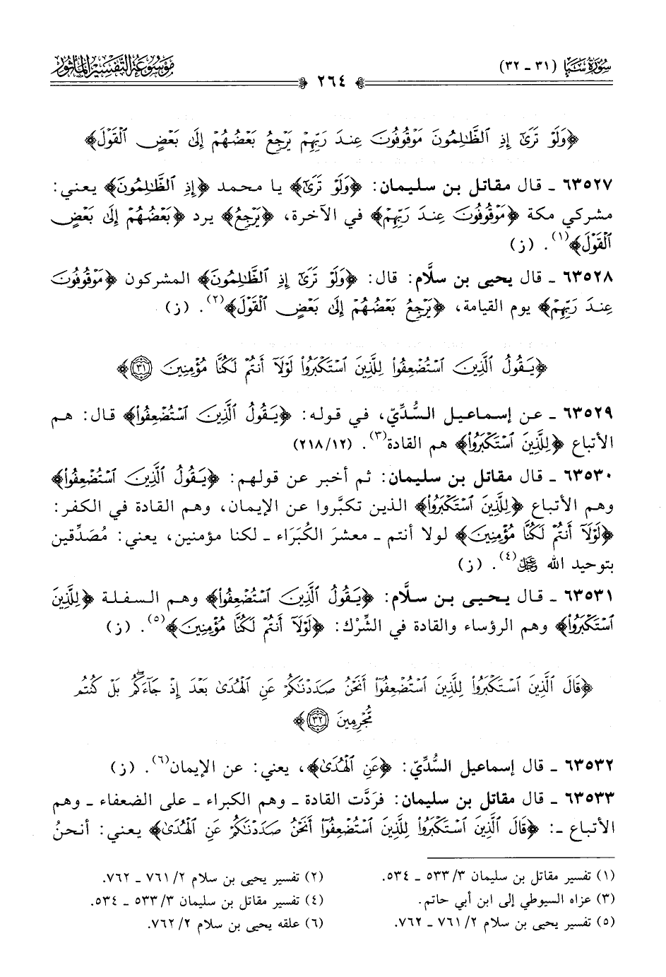 ٦٣٥٣١ - قال يحيى بن سلّام: {يَقُولُ الَّذِينَ اسْتُضْعِفُوا} وهم السفلة {لِلَّذِينَ اسْتَكْبَرُوا} وهم الرؤساء والقادة في الشِّرْك: {لَوْلا أنْتُمْ لَكُنّا مُؤْمِنِينَ} (¬٥). (ز)
