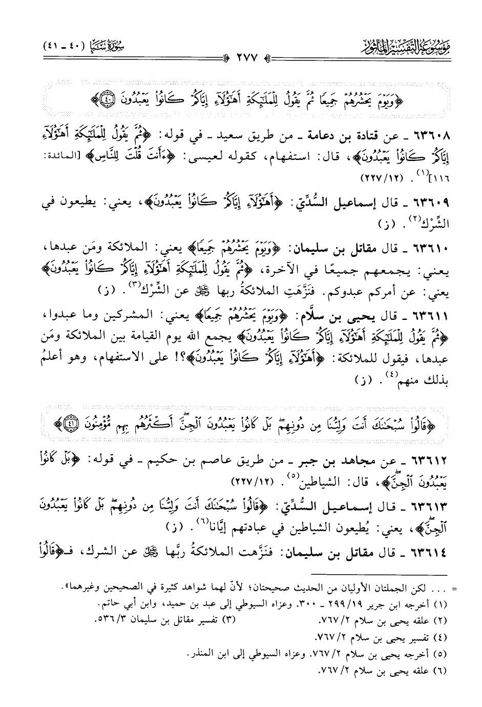 ٦٣٦١٣ - قال إسماعيل السُّدِّيّ: {قالُوا سُبْحانَكَ أنْتَ ولِيُّنا مِن دُونِهِمْ بَلْ كانُوا يَعْبُدُونَ الجِنَّ}، يعني: يُطيعون الشياطين في عبادتهم إيّانا (¬٦). (ز)