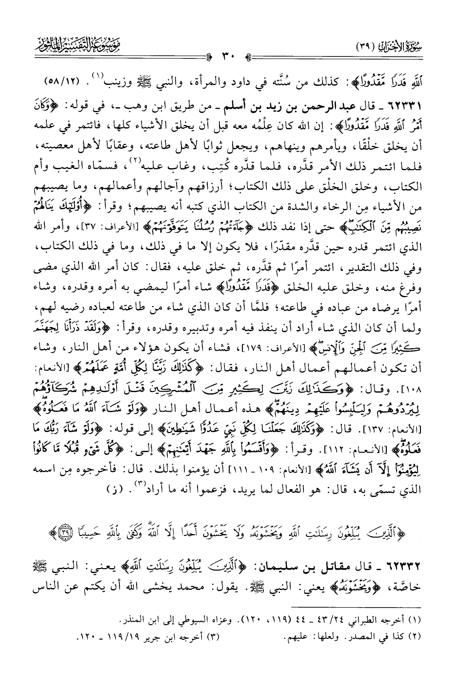 ٦٢٣٣١ - قال عبد الرحمن بن زيد بن أسلم - من طريق ابن وهب-، في قوله: {وكانَ أمْرُ اللَّهِ قَدَرًا مَقْدُورًا}: إن الله كان عِلْمُه معه قبل أن يخلق الأشياء كلها، فائتمر في علمه أن يخلق خلْقًا، ويأمرهم وينهاهم، ويجعل ثوابًا لأهل طاعته، وعقابًا لأهل معصيته، فلما ائتمر ذلك الأمر قدَّره، فلما قدَّره كُتِب، وغاب عليه (¬٢)، فسمّاه الغيب وأم الكتاب، وخلق الخلْق على ذلك الكتاب؛ أرزاقهم وآجالهم وأعمالهم، وما يصيبهم من الأشياء مِن الرخاء والشدة من الكتاب الذي كتبه أنه يصيبهم؛ وقرأ: {أُولَئِكَ يَنالُهُمْ نَصِيبُهُمْ مِنَ الكِتابِ} حتى إذا نفد ذلك {جاءَتْهُمْ رُسُلُنا يَتَوَفَّوْنَهُمْ} [الأعراف: ٣٧]، وأمر الله الذي ائتمر قدره حين قدَّره مقدّرًا، فلا يكون إلا ما في ذلك، وما في ذلك الكتاب، وفي ذلك التقدير، ائتمر أمرًا ثم قدَّره، ثم خلق عليه، فقال: كان أمر الله الذي مضى وفرغ منه، وخلق عليه الخلق {قَدَرًا مَقْدُورًا} شاء أمرًا ليمضي به أمره وقدره، وشاء أمرًا يرضاه من عباده في طاعته؛ فلمّا أن كان الذي شاء من طاعته لعباده رضيه لهم، ولما أن كان الذي شاء أراد أن ينفذ فيه أمره وتدبيره وقدره، وقرأ: {ولَقَدْ ذَرَأْنا لِجَهَنَّمَ كَثِيرًا مِنَ الجِنِّ والإنْسِ} [الأعراف: ١٧٩]، فشاء أن يكون هؤلاء من أهل النار، وشاء أن تكون أعمالهم أعمال أهل النار، فقال: {كَذَلِكَ زَيَّنّا لِكُلِّ أُمَّةٍ عَمَلَهُمْ} [الأنعام: ١٠٨]. وقال: {وكَذَلِكَ زَيَّنَ لِكَثِيرٍ مِنَ المُشْرِكِينَ قَتْلَ أوْلادِهِمْ شُرَكاؤُهُمْ لِيُرْدُوهُمْ ولِيَلْبِسُوا عَلَيْهِمْ دِينَهُمْ} هذه أعمال أهل النار {ولَوْ شاءَ اللَّهُ ما فَعَلُوهُ} [الأنعام: ١٣٧]. قال: {وكَذَلِكَ جَعَلْنا لِكُلِّ نَبِيٍّ عَدُوًّا شَياطِينَ} إلى قوله: {ولَوْ شاءَ رَبُّكَ ما فَعَلُوهُ} [الأنعام: ١١٢]. وقرأ: {وأَقْسَمُوا بِاللَّهِ جَهْدَ أيْمانِهِمْ} إلى {كُلَّ شَيْءٍ قُبُلًا ما كانُوا لِيُؤْمِنُوا إلّا أنْ يَشاءَ اللَّهُ} [الأنعام: ١٠٩ - ١١١] أن يؤمنوا بذلك. قال: فأخرجوه مِن اسمه الذي تسمّى به، قال: هو الفعال لما يريد، فزعموا أنه ما أراد (¬٣). (ز)