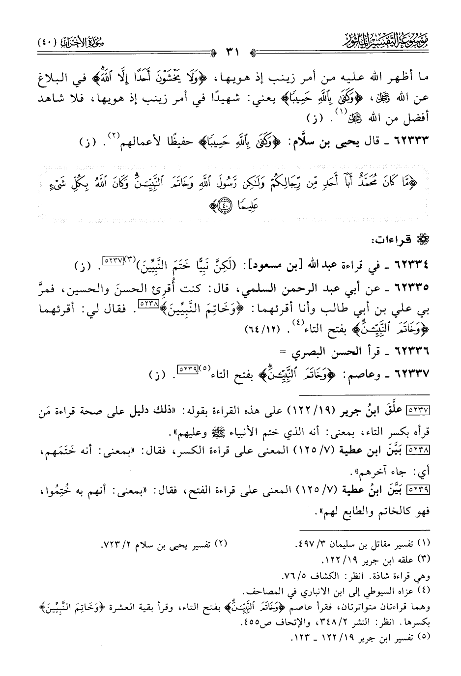 [٥٢٣٧] علَّقَ ابنُ جرير (١٩/ ١٢٢) على هذه القراءة بقوله: «ذلك دليل على صحة قراءة مَن قرأه بكسر التاء، بمعنى: أنه الذي ختم الأنبياء - صلى الله عليه وسلم - وعليهم».