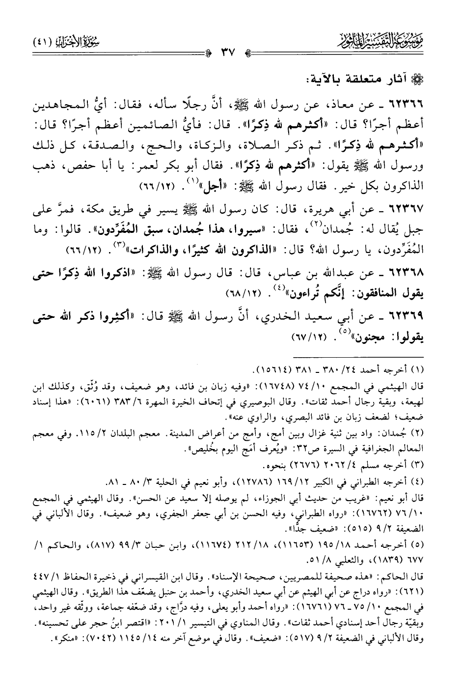 ٦٢٣٦٧ - عن أبي هريرة، قال: كان رسول الله - صلى الله عليه وسلم - يسير في طريق مكة، فمرَّ على جبل يُقال له: جُمدان (¬٢)، فقال: «سيروا، هذا جُمدان، سبق المُفَرِّدون». قالوا: وما المُفَرِّدون، يا رسول الله؟ قال: «الذاكرون الله كثيرًا، والذاكرات» (¬٣). (١٢/ ٦٦)