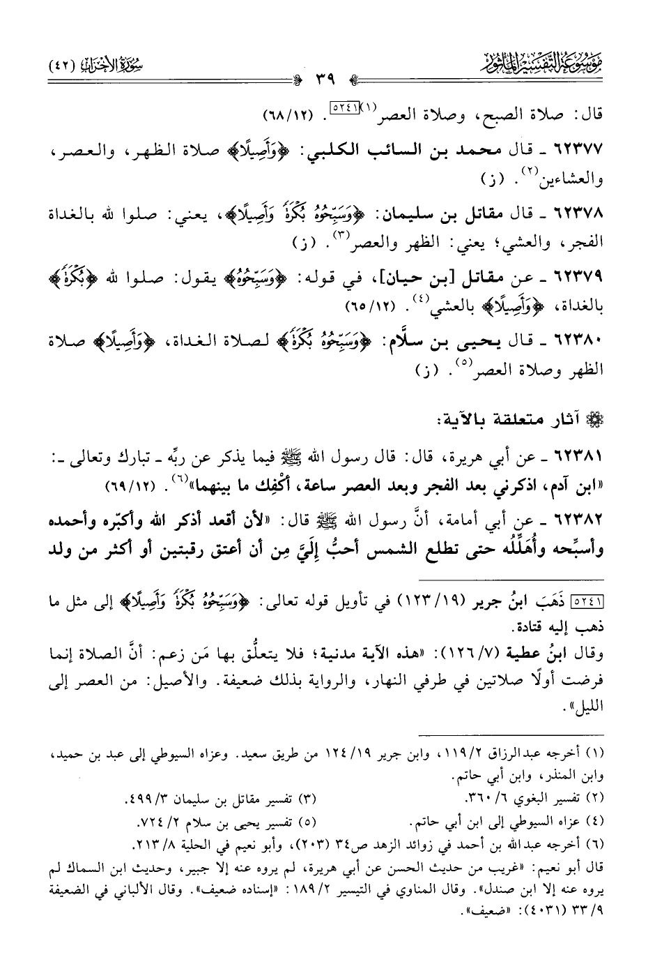 ٦٢٣٨٠ - قال يحيى بن سلّام: {وسَبِّحُوهُ بُكْرَةً} لصلاة الغداة، {وأَصِيلًا} صلاة الظهر وصلاة العصر (¬٥). (ز)