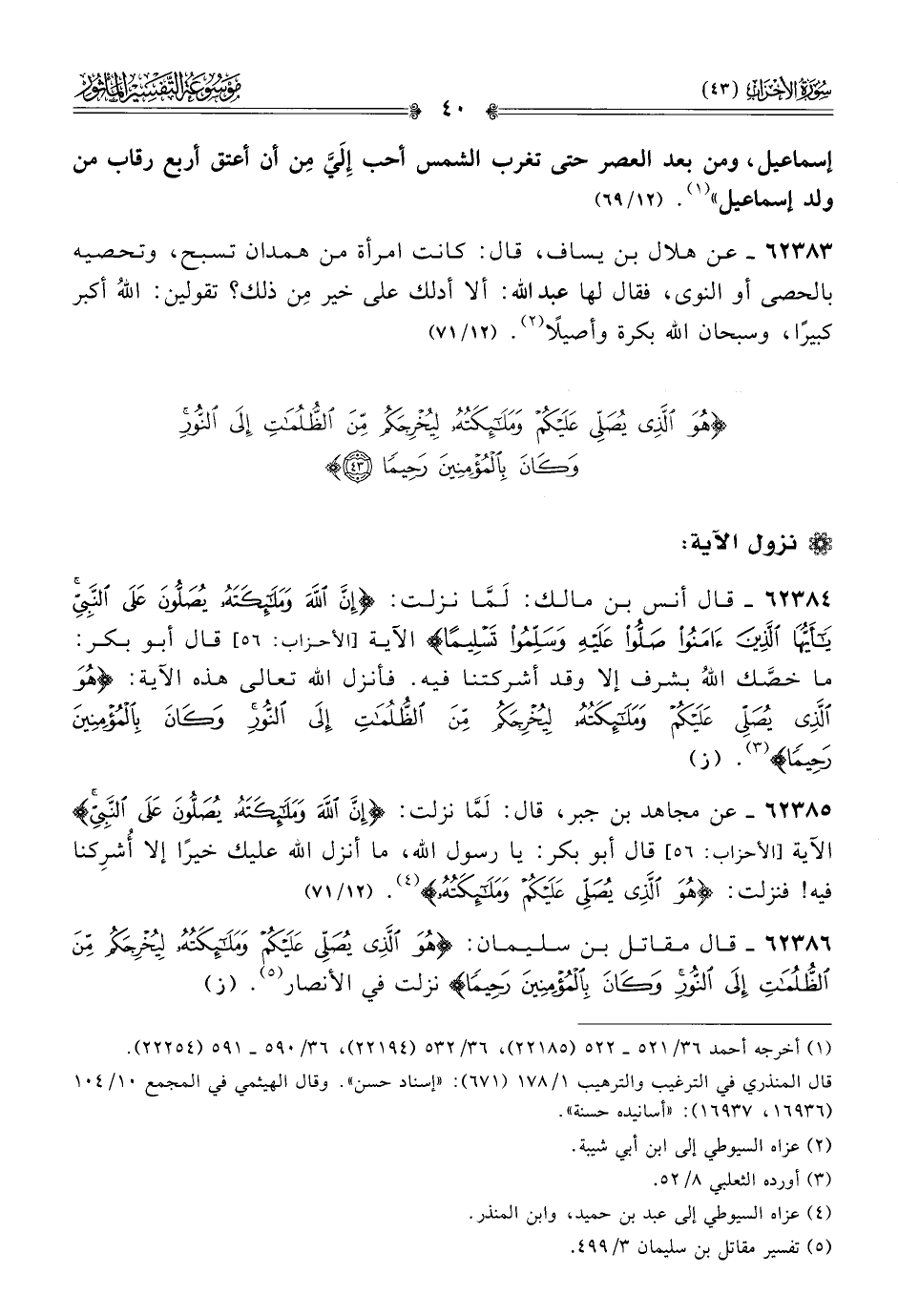 ٦٢٣٨٦ - قال مقاتل بن سليمان: {هُوَ الَّذِي يُصَلِّي عَلَيْكُمْ ومَلائِكَتُهُ لِيُخْرِجَكُمْ مِنَ الظُّلُماتِ إلى النُّورِ وكانَ بِالمُؤْمِنِينَ رَحِيمًا} نزلت في الأنصار (¬٥). (ز)