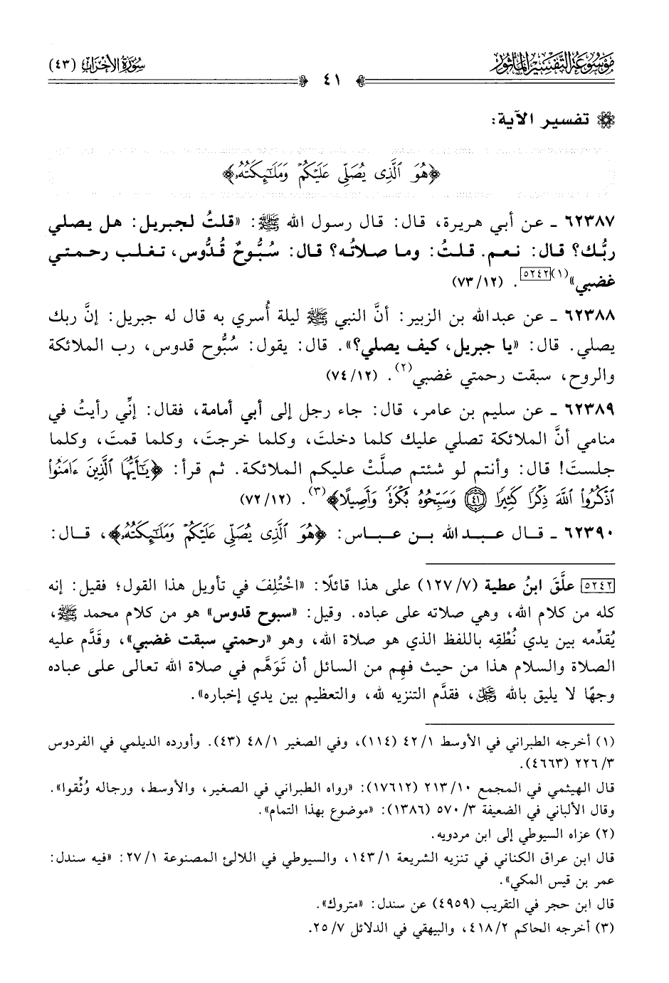 ٦٢٣٩٠ - قال عبد الله بن عباس: {هُوَ الَّذِي يُصَلِّي عَلَيْكُمْ ومَلائِكَتُهُ}، قال: