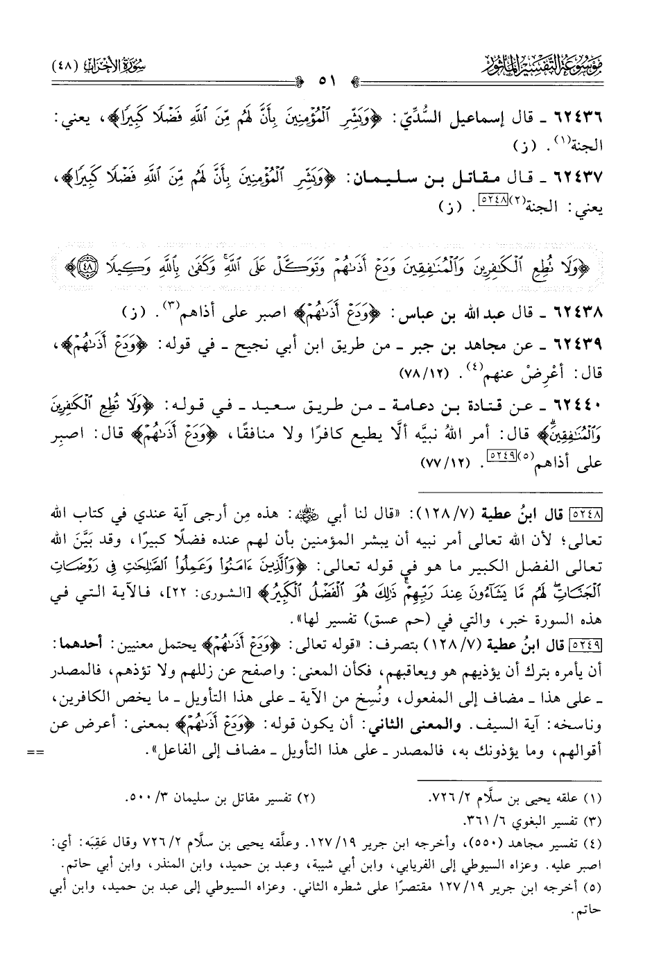 [٥٢٤٩] قال ابنُ عطية (٧/ ١٢٨) بتصرف: «قوله تعالى: {ودع آذاهم} يحتمل معنيين: أحدهما: أن يأمره بترك أن يؤذيهم هو ويعاقبهم، فكأن المعنى: واصفح عن زللهم ولا تؤذهم، فالمصدر -على هذا- مضاف إلى المفعول، ونُسِخ من الآية -على هذا التأويل- ما يخص الكافرين، وناسخه: آية السيف. والمعنى الثاني: أن يكون قوله: {ودع آذاهم} بمعنى: أعرض عن أقوالهم، وما يؤذونك به، فالمصدر -على هذا التأويل- مضاف إلى الفاعل».