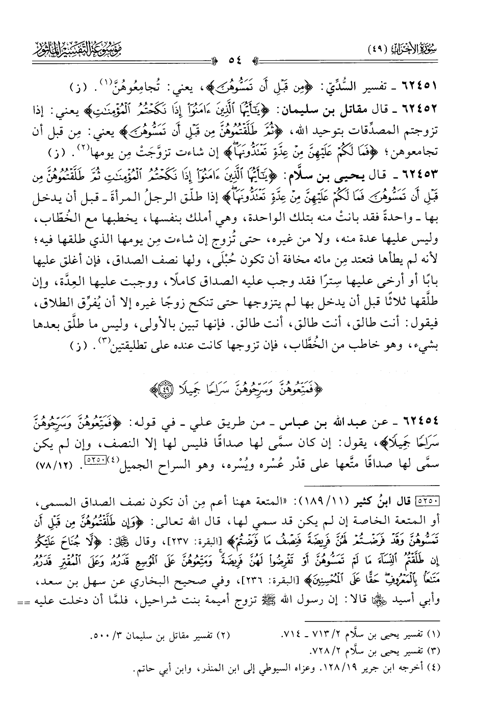 ٦٢٤٥٤ - عن عبد الله بن عباس -من طريق علي- في قوله: {فَمَتِّعُوهُنَّ وسَرِّحُوهُنَّ سَراحًا جَمِيلًا}، يقول: إن كان سمّى لها صداقًا فليس لها إلا النصف، وإن لم يكن سمّى لها صداقًا متَّعها على قدْر عُسْره ويُسْره، وهو السراح الجميل (¬٤) [٥٢٥٠]. (١٢/ ٧٨)