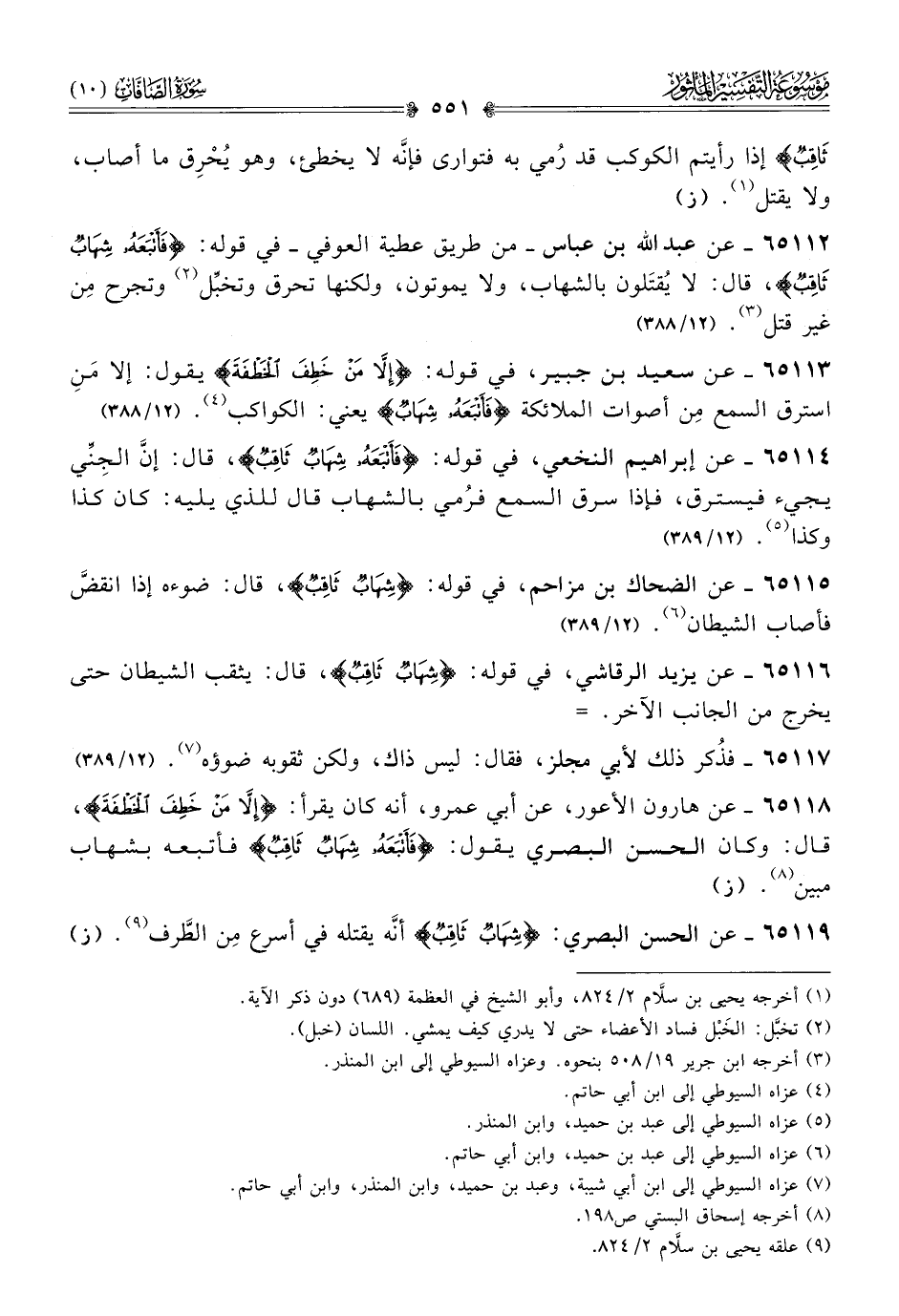 ٦٥١١٣ - عن سعيد بن جبير، في قوله: {إلّا مَن خَطِفَ الخَطْفَةَ} يقول: إلا مَنِ استرق السمع مِن أصوات الملائكة {فَأَتْبَعَهُ شِهابٌ} يعني: الكواكب (¬٤). (١٢/ ٣٨٨)