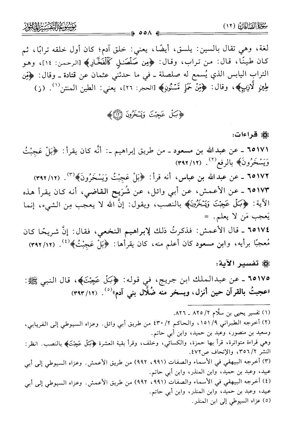 ٦٥١٧١ - عن عبد الله بن مسعود -من طريق إبراهيم- أنّه كان يقرأ: «بَلْ عَجِبْتُ ويَسْخَرُونَ» بالرفع (¬٢). (١٢/ ٣٩١)