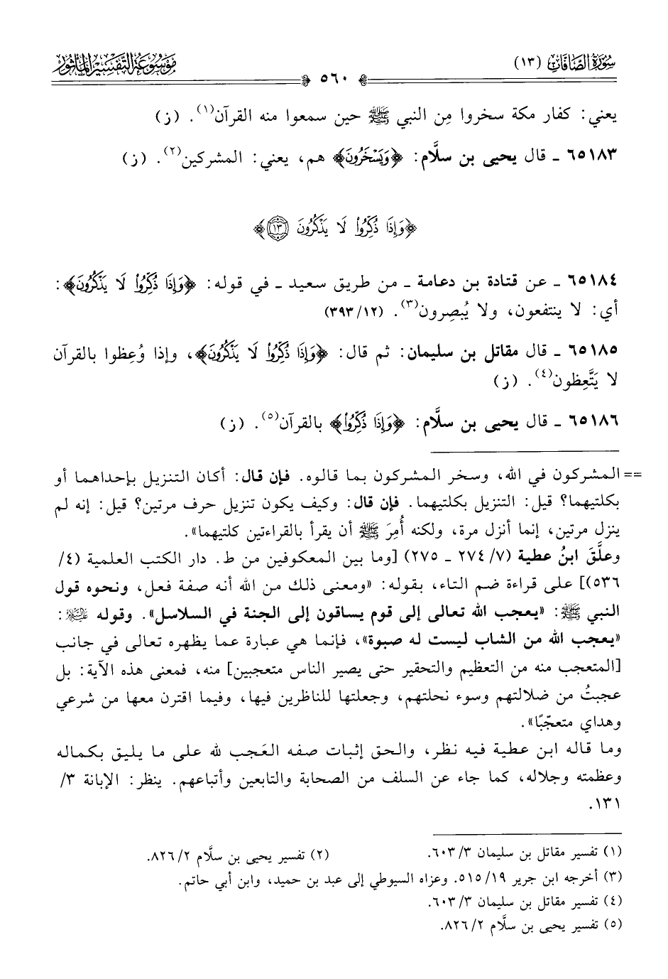 ٦٥١٨٦ - قال يحيى بن سلّام: {وإذا ذُكِّرُوا} بالقرآن (¬٥). (ز)