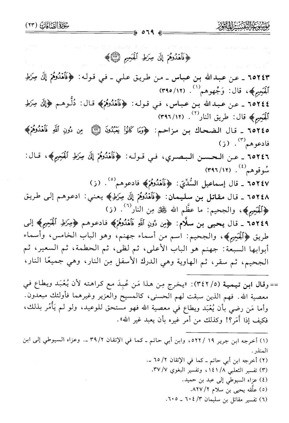 ٦٥٢٤٤ - عن عبد الله بن عباس، في قوله: {فاهْدُوهُمْ} قال: دُلُّوهم {إلى صِراطِ الجَحِيمِ} قال: طريق النار (¬٢). (١٢/ ٣٩٦)
