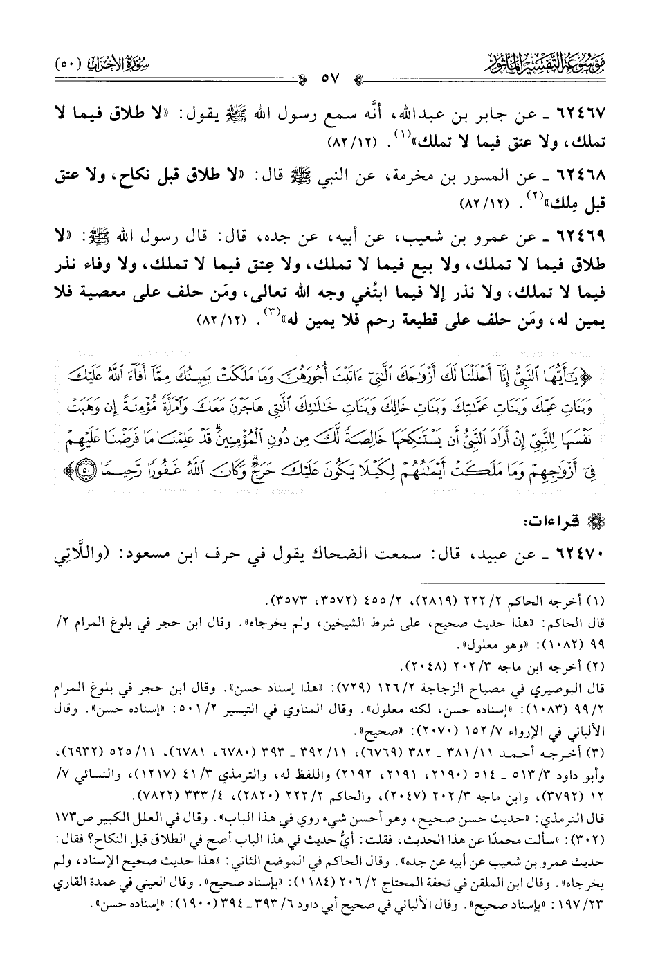 ٦٢٤٦٧ - عن جابر بن عبد الله، أنّه سمع رسول الله - صلى الله عليه وسلم - يقول: «لا طلاق فيما لا تملك، ولا عتق فيما لا تملك» (¬١). (١٢/ ٨٢)