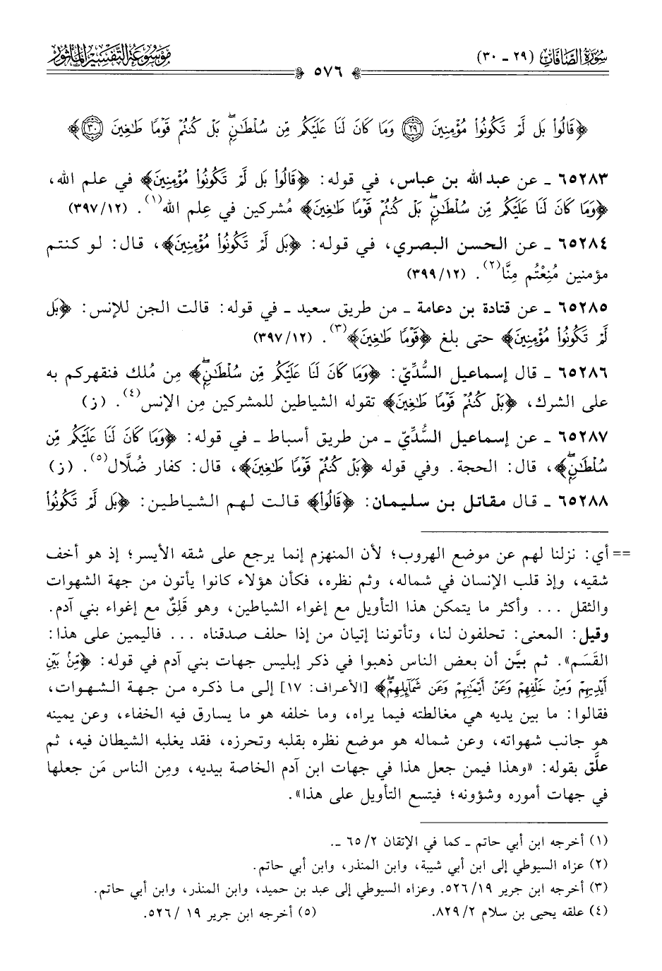 ٦٥٢٨٦ - قال إسماعيل السُّدِّيّ: {وما كانَ لَنا عَلَيْكُمْ مِن سُلْطانٍ} مِن مُلك فنقهركم به على الشرك، {بَلْ كُنْتُمْ قَوْمًا طاغِينَ} تقوله الشياطين للمشركين مِن الإنس (¬٤). (ز)