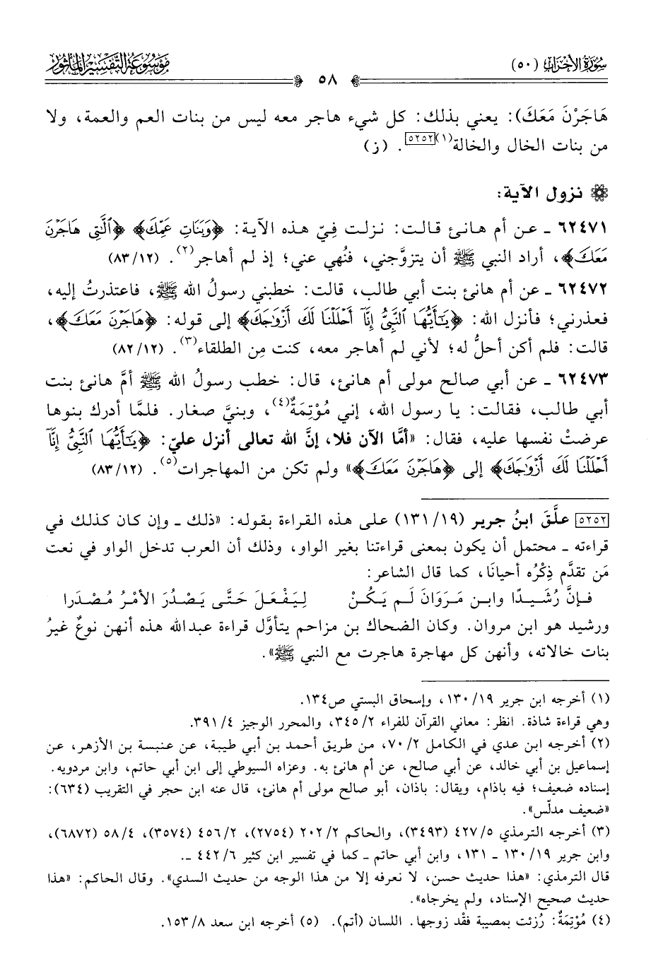 ٦٢٤٧٢ - عن أم هانئ بنت أبي طالب، قالت: خطبني رسولُ الله - صلى الله عليه وسلم -، فاعتذرتُ إليه، فعذرني؛ فأنزل الله: {يا أيُّها النبي إنّا أحْلَلْنا لَكَ أزْواجَكَ} إلى قوله: {هاجَرْنَ مَعَكَ}، قالت: فلم أكن أحلُّ له؛ لأني لم أهاجر معه، كنت مِن الطلقاء (¬٣). (١٢/ ٨٢)