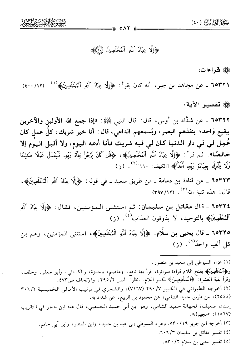 ٦٥٣٢٣ - عن قتادة بن دعامة -من طريق سعيد- في قوله: {إلّا عِبادَ اللَّهِ المُخْلَصِينَ}، قال: هذه ثنية الله (¬٣). (١٢/ ٣٩٧)