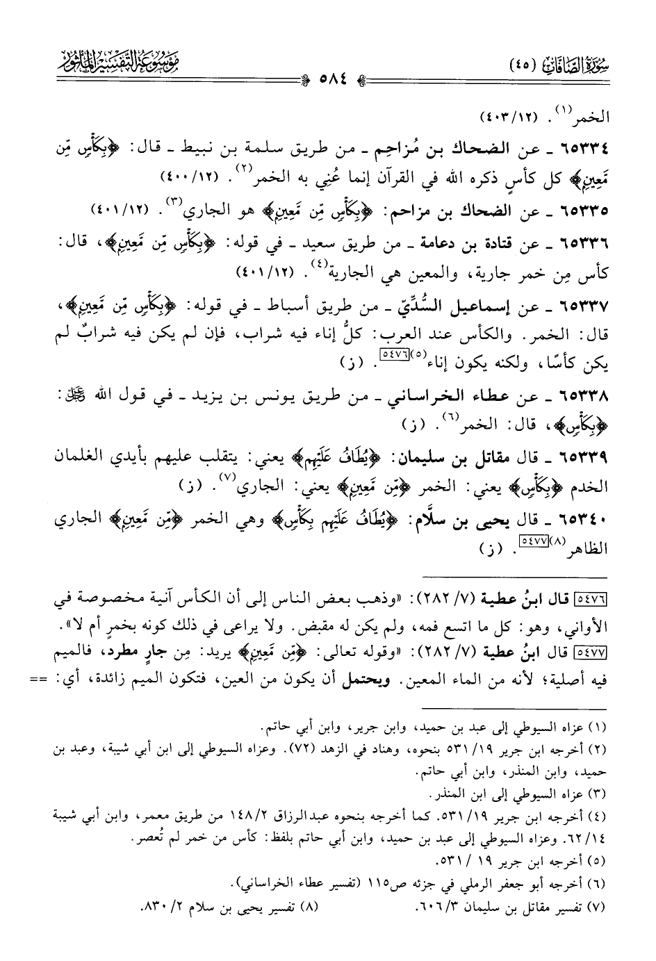 ٦٥٣٣٥ - عن الضحاك بن مزاحم: {بِكَأْسٍ مِن مَعِينٍ} هو الجاري (¬٣). (١٢/ ٤٠١)