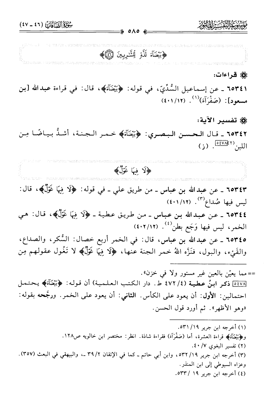 [٥٤٧٨] ذكر ابنُ عطية (٤/ ٤٧٢ ط: دار الكتب العلمية) أن قوله: {بَيْضاءَ} يحتمل احتمالين: الأول: أن يعود على الكأس. الثاني: أن يعود على الخمر. ورجَّحه بقوله: «وهو الأظهر». ثم أورد قول الحسن.