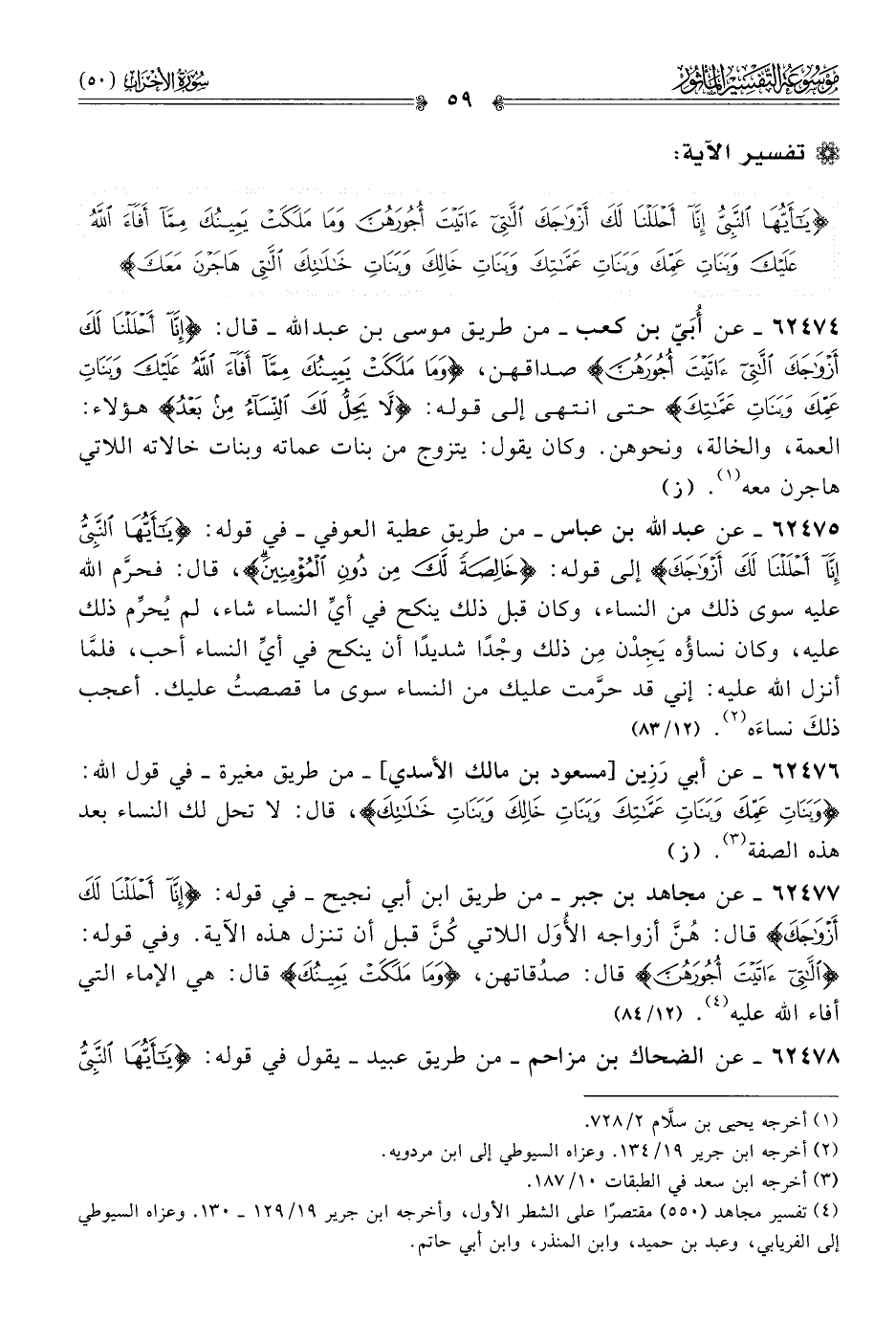 ٦٢٤٧٤ - عن أُبَيّ بن كعب -من طريق موسى بن عبد الله- قال: {إنّا أحْلَلْنا لَكَ أزْواجَكَ اللّاتِي آتَيْتَ أُجُورَهُنَّ} صداقهن، {وما مَلَكَتْ يَمِينُكَ مِمّا أفاءَ اللَّهُ عَلَيْكَ وبَناتِ عَمِّكَ وبَناتِ عَمّاتِكَ} حتى انتهى إلى قوله: {لا يَحِلُّ لَكَ النِّساءُ مِن بَعْدُ} هؤلاء: العمة، والخالة، ونحوهن. وكان يقول: يتزوج من بنات عماته وبنات خالاته اللاتي هاجرن معه (¬١). (ز)