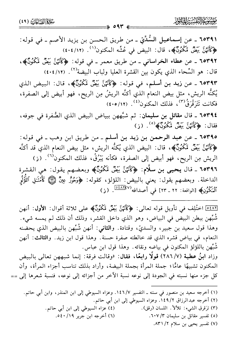 ٦٥٣٩٣ - عن زيد بن أسلم، في قوله: {كَأَنَّهُنَّ بَيْضٌ مَكْنُونٌ}، قال: البيض الذي يُكنُّه الريش، مثل بيض النعام الذي أكنَّه الريشُ مِن الريح، فهو أبيض إلى الصفرة، فكانت تَتَرَقْرَقُ (¬٣)، فذلك المكنون (¬٤). (١٢/ ٤٠٥)