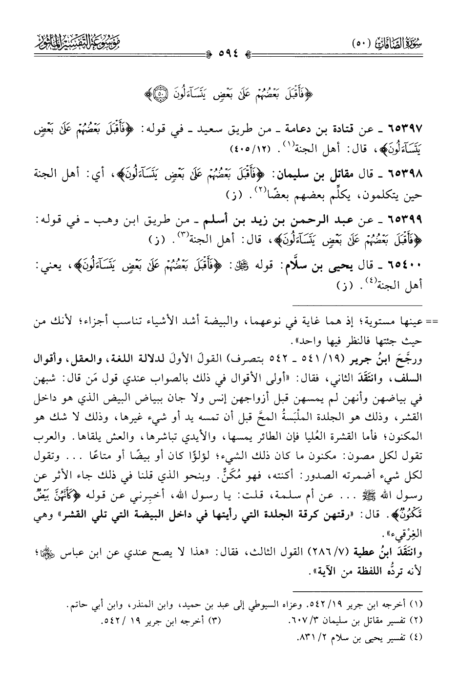 ٦٥٤٠٠ - قال يحيى بن سلّام: قوله - عز وجل -: {فَأَقْبَلَ بَعْضُهُمْ عَلى بَعْضٍ يَتَساءَلُونَ}، يعني: أهل الجنة (¬٤). (ز)