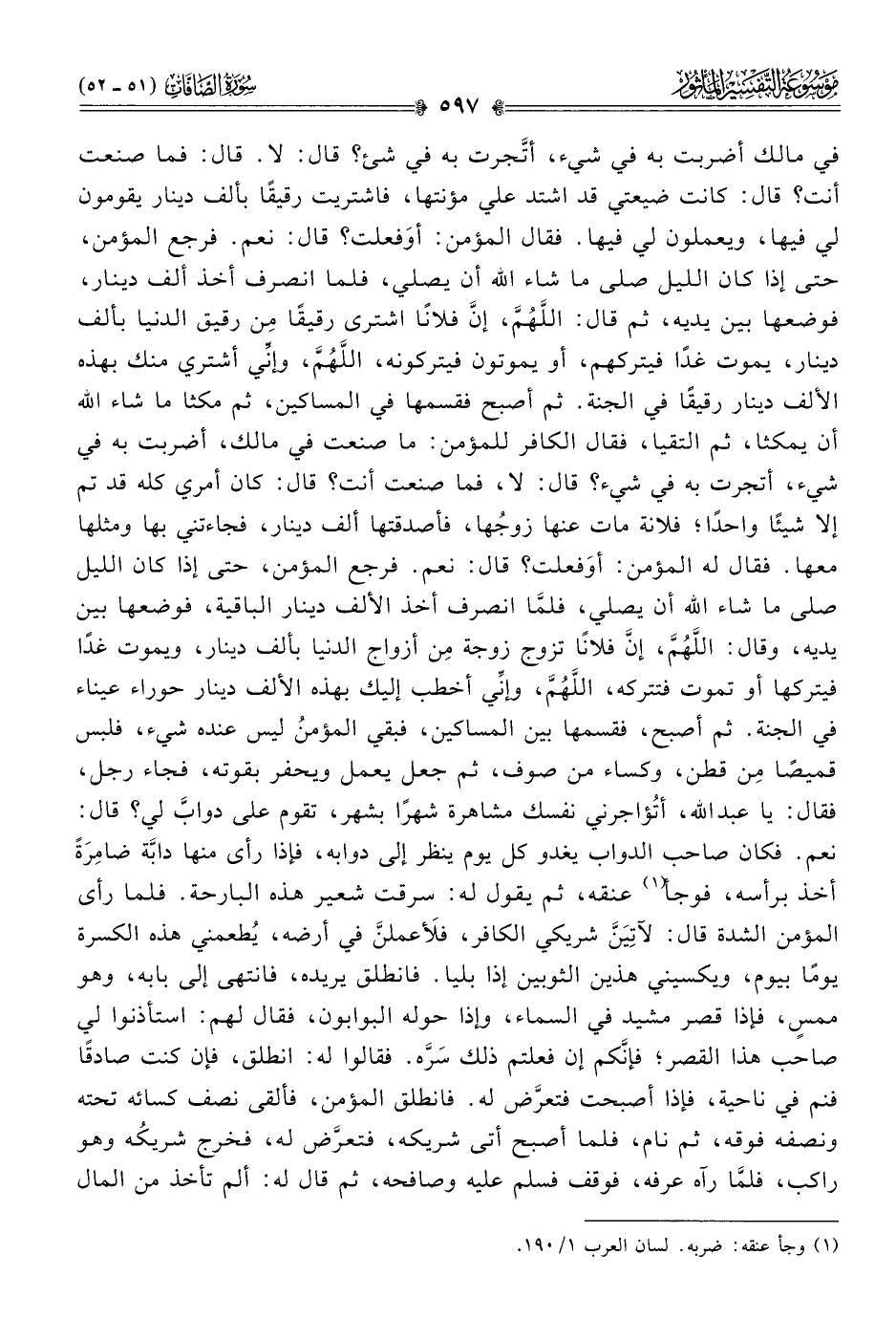في مالك، أضربت به في شيء، أتجرت به في شيء؟ قال: لا، فما صنعت أنت؟ قال: كان أمري كله قد تم إلا شيئًا واحدًا؛ فلانة مات عنها زوجُها، فأصدقتها ألف دينار، فجاءتني بها ومثلها معها. فقال له المؤمن: أوَفعلت؟ قال: نعم. فرجع المؤمن، حتى إذا كان الليل صلى ما شاء الله أن يصلي، فلمّا انصرف أخذ الألف دينار الباقية، فوضعها بين يديه، وقال: اللهمَّ، إنّ فلانًا تزوج زوجة مِن أزواج الدنيا بألف دينار، ويموت غدًا فيتركها أو تموت فتتركه، اللهم، وإنِّي أخطب إليك بهذه الألف دينار حوراء عيناء في الجنة. ثم أصبح، فقسمها بين المساكين، فبقي المؤمنُ ليس عنده شيء، فلبس قميصًا مِن قطن، وكساء من صوف، ثم جعل يعمل ويحفر بقوته، فجاء رجل، فقال: يا عبد الله، أتُؤاجرني نفسك مشاهرة شهرًا بشهر، تقوم على دوابَّ لي؟ قال: نعم. فكان صاحب الدواب يغدو كل يوم ينظر إلى دوابه، فإذا رأى منها دابَّة ضامِرَةً أخذ برأسه، فوجأ (¬١) عنقه، ثم يقول له: سرقت شعير هذه البارحة. فلما رأى المؤمن الشدة قال: لآتِيَنَّ شريكي الكافر، فلَأعملنَّ في أرضه، يُطعمني هذه الكسرة يومًا بيوم، ويكسيني هذين الثوبين إذا بليا. فانطلق يريده، فانتهى إلى بابه، وهو ممسٍ، فإذا قصر مشيد في السماء، وإذا حوله البوابون، فقال لهم: استأذنوا لي صاحب هذا القصر؛ فإنّكم إن فعلتم ذلك سَرَّه. فقالوا له: انطلق، فإن كنت صادقًا فنم في ناحية، فإذا أصبحت فتعرَّض له. فانطلق المؤمن، فألقى نصف كسائه تحته ونصفه فوقه، ثم نام، فلما أصبح أتى شريكه، فتعرَّض له، فخرج شريكُه وهو راكب، فلمّا رآه عرفه، فوقف فسلم عليه وصافحه، ثم قال له: ألم تأخذ من المال