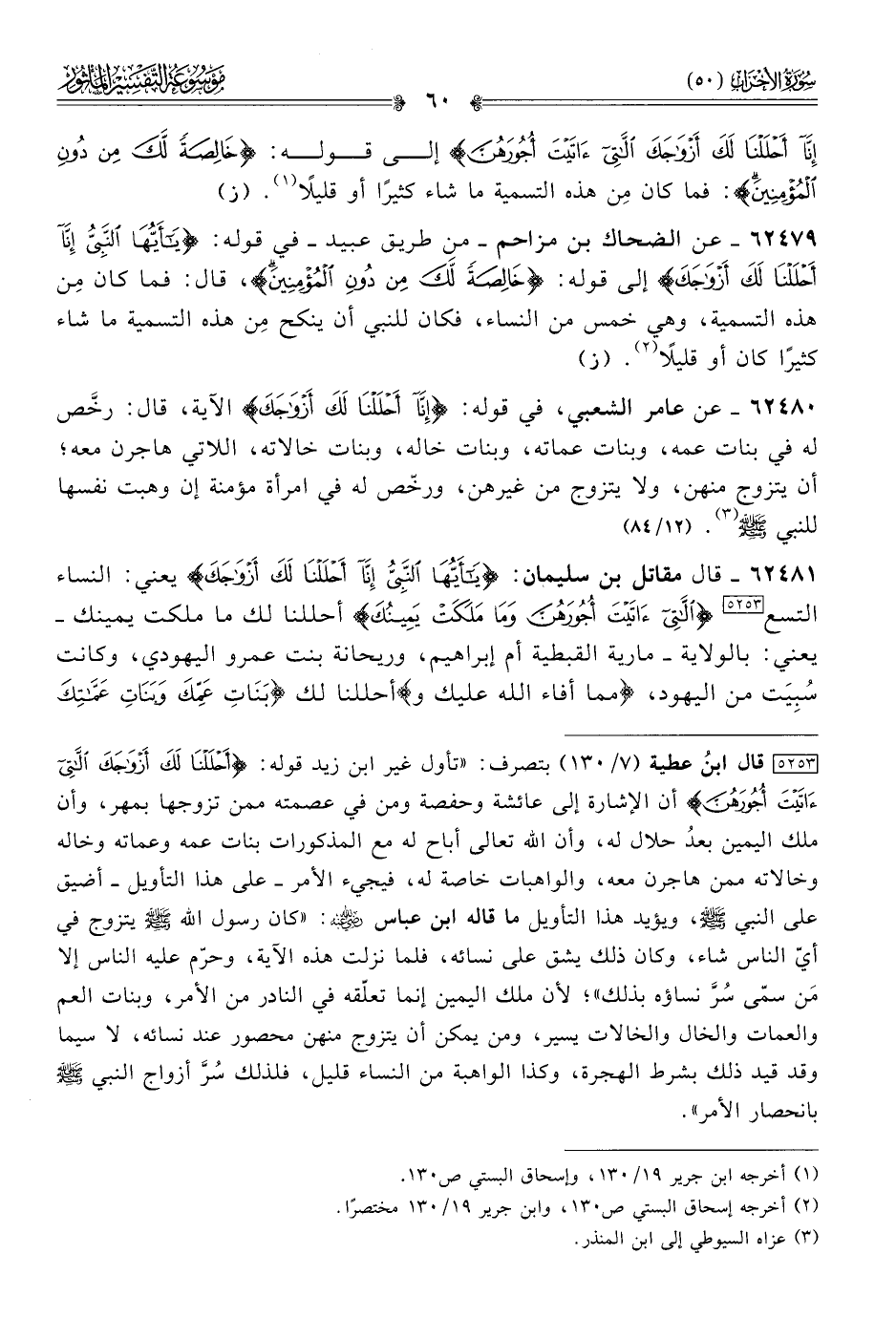 ٦٢٤٨٠ - عن عامر الشعبي، في قوله: {إنّا أحْلَلْنا لَكَ أزْواجَكَ} الآية، قال: رخَّص له في بنات عمه، وبنات عماته، وبنات خاله، وبنات خالاته، اللاتي هاجرن معه؛ أن يتزوج منهن، ولا يتزوج من غيرهن، ورخّص له في امرأة مؤمنة إن وهبت نفسها للنبي - صلى الله عليه وسلم - (¬٣). (١٢/ ٨٤)