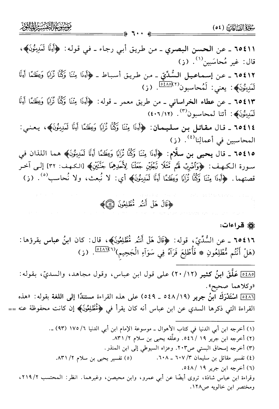 ٦٥٤١٦ - عن السُّدِّيّ، قوله: {قالَ هَلْ أنْتُم مُّطَّلِعُونَ}، قال: كان ابنُ عباس يقرؤها: (هَلْ أنْتُم مُّطْلِعُونِ* فَأُطْلِعَ فَرَآهُ فِي سَوَآءِ الجَحِيمِ) (¬٦) [٥٤٨٦]. (ز)