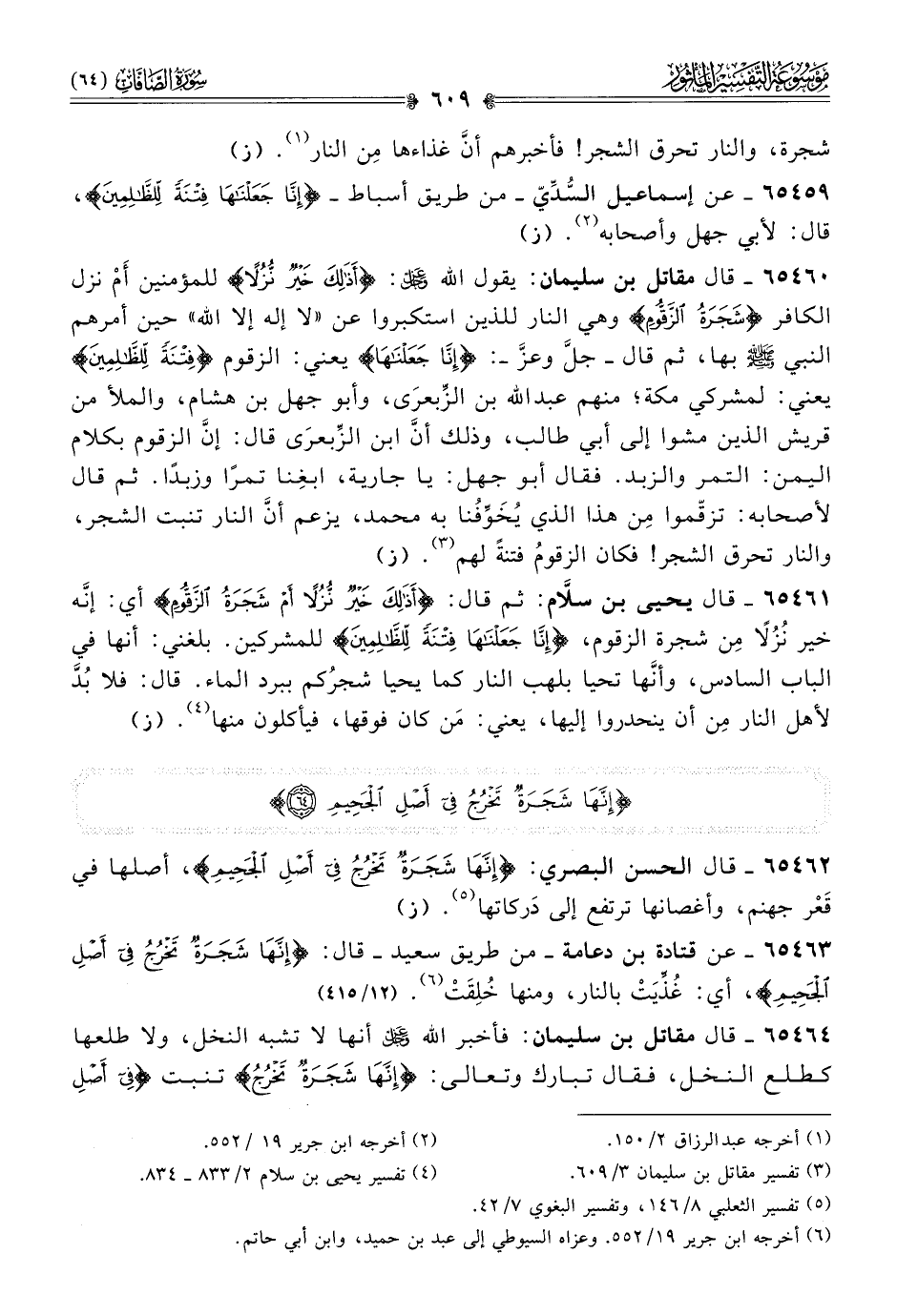 ٦٥٤٦٢ - قال الحسن البصري: {إنَّها شَجَرَةٌ تَخْرُجُ فِي أصْلِ الجَحِيمِ}، أصلها في قَعْر جهنم، وأغصانها ترتفع إلى دَركاتها (¬٥). (ز)