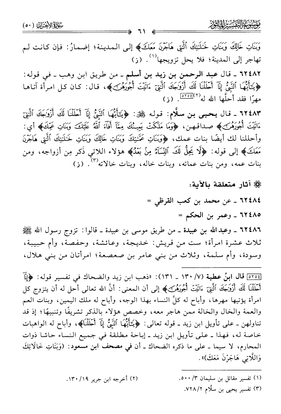 ٦٢٤٨٣ - قال يحيى بن سلّام: قوله - عز وجل -: {يَأَيُّها النبي إنّا أحْلَلْنا لَكَ أزْواجَكَ اللّاتِي آتَيْتَ أُجُورَهُنَّ} صداقهن، {وما مَلَكَتْ يَمِينُكَ مِمّا أفاءَ اللَّهُ عَلَيْكَ وبَناتِ عَمِّكَ} أي: وأحللنا لك أيضًا بنات عمك، {وبَناتِ عَمّاتِكَ وبَناتِ خالِكَ وبَناتِ خالاتِكَ اللّاتِي هاجَرْنَ مَعَكَ} إلى قوله: {لا يَحِلُّ لَكَ النِّساءُ مِن بَعْدُ} هؤلاء اللاتي ذَكر مِن أزواجه، ومن بنات عمه، ومن بنات عماته، وبنات خاله، وبنات خالاته (¬٣). (ز)