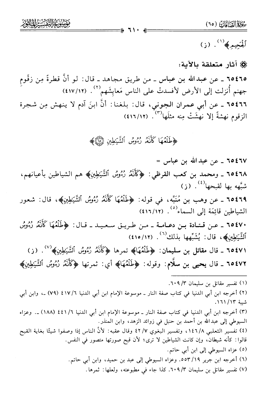 ٦٥٤٦٩ - عن وهب بن مُنَبِّه، في قوله: {طَلْعُها كَأَنَّهُ رُءُوسُ الشَّياطِينِ}، قال: شعور الشياطين قائِمَة إلى السماء (¬٥). (١٢/ ٤١٦)