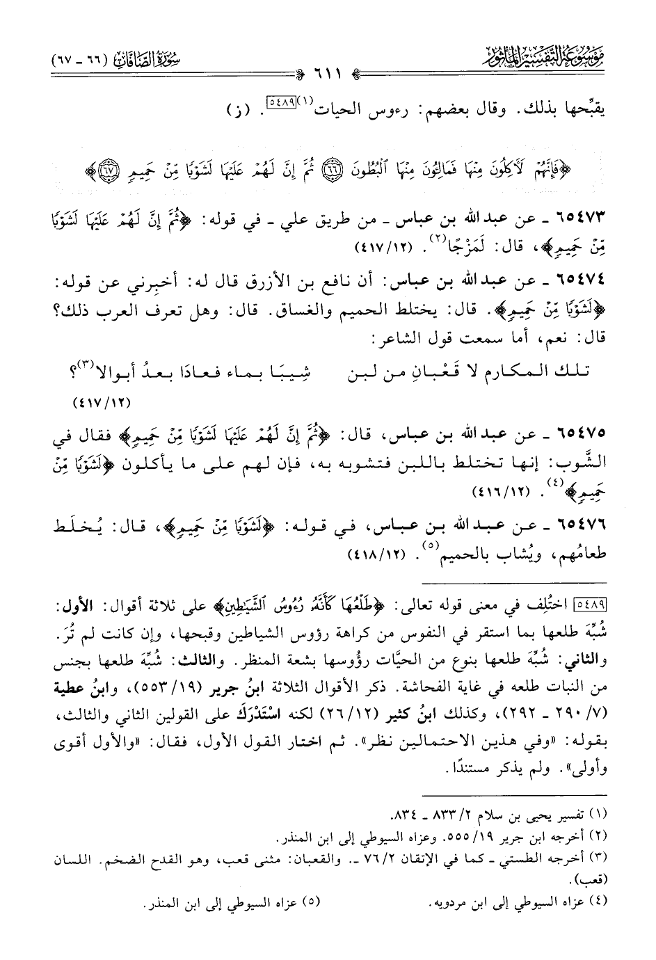 [٥٤٨٩] اختُلِف في معنى قوله تعالى: {طَلْعُها كَأَنَّهُ رُءُوسُ الشَّياطِينِ} على ثلاثة أقوال: الأول: شُبِّهَ طلعها بما استقر في النفوس من كراهة رؤوس الشياطين وقبحها، وإن كانت لم تُرَ. والثاني: شُبِّهَ طلعها بنوع من الحيّات رؤُوسها بشعة المنظر. والثالث: شُبِّهَ طلعها بجنس من النبات طلعه في غاية الفحاشة. ذكر الأقوال الثلاثة ابنُ جرير (١٩/ ٥٥٣)، وابنُ عطية (٧/ ٢٩٠ - ٢٩٢)، وكذلك ابنُ كثير (١٢/ ٢٦) لكنه اسْتَدْرَكَ على القولين الثاني والثالث، بقوله: «وفي هذين الاحتمالين نظر». ثم اختارالقول الأول، فقال: «والأول أقوى وأولى». ولم يذكر مستندًا.