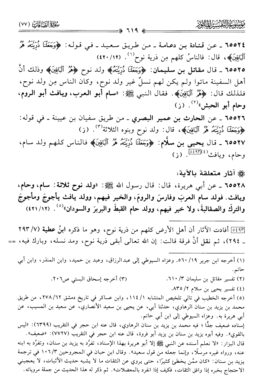 ٦٥٥٢٧ - قال يحيى بن سلّام: {وجَعَلْنا ذُرِّيَّتَهُ هُمُ الباقِينَ} فالناس كلهم ولد سام، وحام، ويافث (¬٤) [٥٤٩٣]. (ز)
