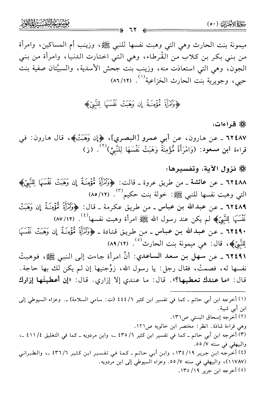 ٦٢٤٩٠ - عن عبد الله بن عباس -من طريق قتادة- {وامْرَأَةً مُؤْمِنَةً إنَّ وهَبَتْ نَفْسَها لِلنَّبِيِّ}، قال: هي ميمونة بنت الحارث (¬٥). (١٢/ ٨٩)